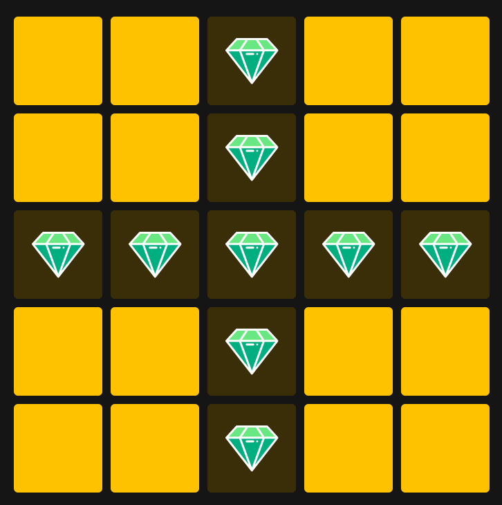 Поле состоит из 25 ячеек, изначально скрытых. Нажатие на ячейку раскрывает ее. Если в ячейке содержался кристалл, увеличивается коэффициент, если мина - игра завершается.